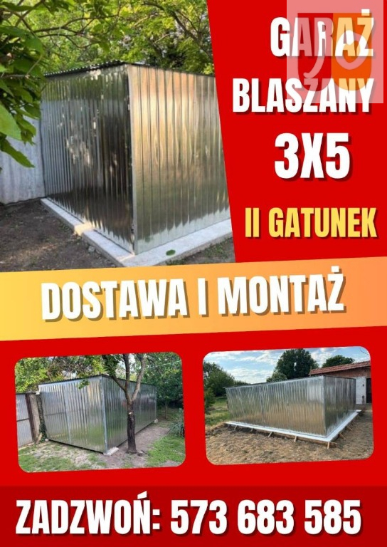 Garaż blaszany o wymiarach 3 × 5 m, II gatunku – idealny jako blaszak na budowę lub schowek. Wyposażony w dach jednospadowy oraz bramę dwuskrzydłową.
