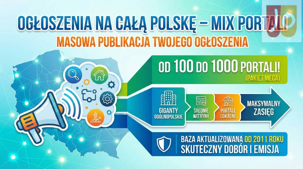 W ramach oferty „Strona WWW - pakiet standardowy” dodamy ogłoszenie promujące Twoją stronę do 200 portali ogłoszeniowych w całej Polsce - zarówno regionalnych, jak i ogólnopolskich.